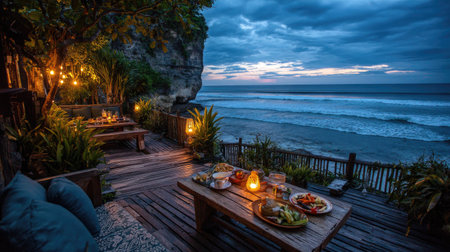 Bali, Indonesia, oceanfront eatery with scenic deck views, secluded seaside eatery featuring vibrant sunset and waves