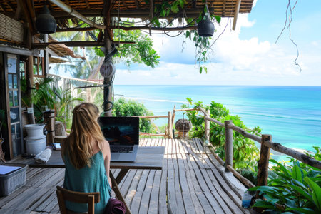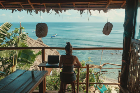 Woman sitting at table with laptop in front of ocean view, inspirational remote work environment with travel vibes