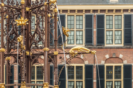 Holland, Den Haag. August 2019. The Hague in English, the Binnenhof is the center of Dutch political life. The buildings overlook the artificial lake with fountains and swans.
