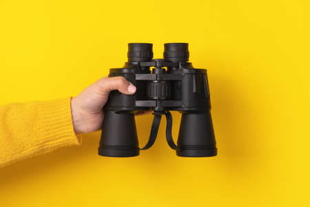 Female hand holds black binoculars on a yellow background. Journey, find and search concept. Banner