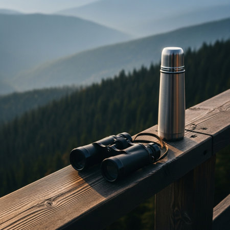 Metal thermos and binoculars on a wooden railing on the background of the mountains