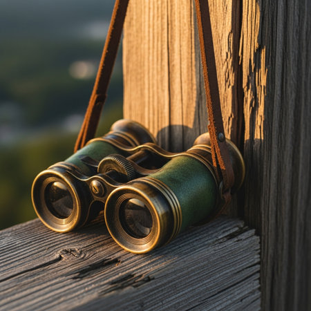 Black binoculars on a wooden table