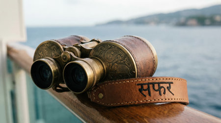 Binoculars rest on a railing near water. The background shows distant hills and coastline. A sense of adventure is evident as tourists explore Indian sights.