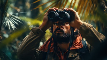 Handsome bearded man with binoculars in the jungle.