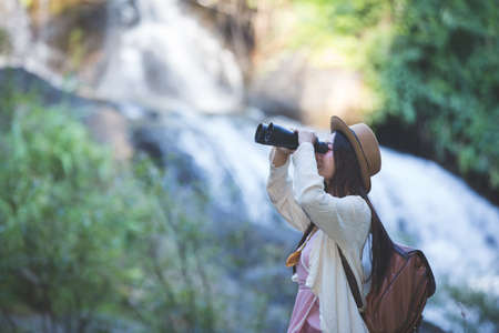 Female tourist who is looking at the binoculars to see the atmosphere at the waterfall