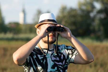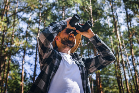 Man tourist in a hat and a plaid shirt looks through binoculars in the forest.