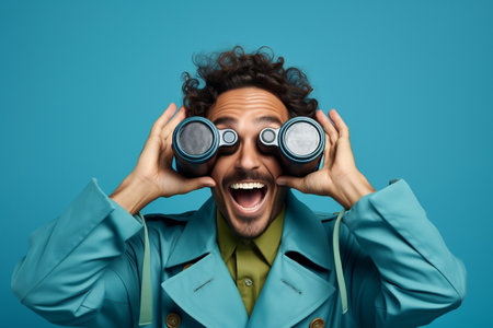 Handsome bearded man looking through binoculars with bright green and blue lights and lens flare