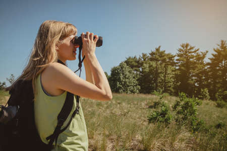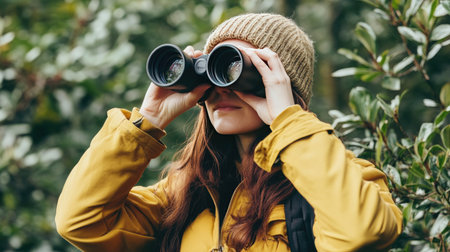 Female birdwatcher in a nature park, adjusting her binoculars while focusing on treetops.