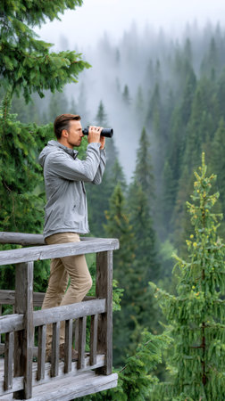 Man looking through binoculars from a wooden cabin balcony overlooking a foggy forest landscape