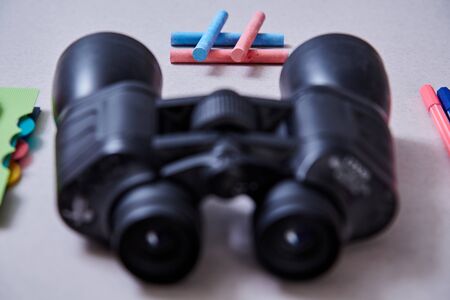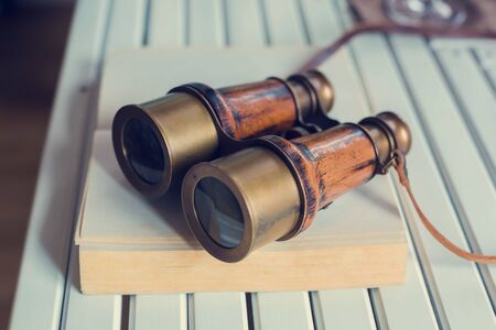 Old binoculars on ancient book. Vision and search concept.