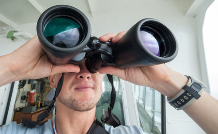 Man looks through binoculars from the boat