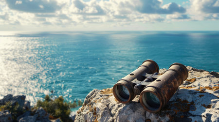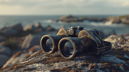 A pair of binoculars rests on a sturdy rock overlooking the ocean, where wind waves crash against the rocky shores and liquid water meets solid bedrock AIG50