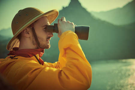 A man traveler-explorer looks into the distance through binoculars against the backdrop of a mountain landscape. Tourism and travel. Discoverer. Retro style.