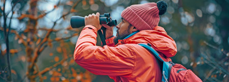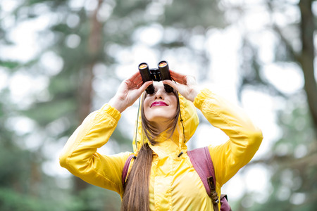 Happy woodland explorer wearing a jacket and beanie and using binoculars