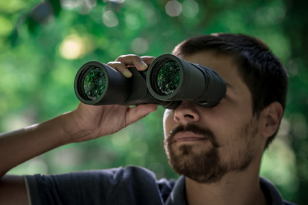 Looking for that special bird. Handsome man using his binoculars to scan the surrounding forest for bird life.