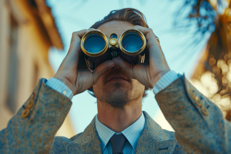 View of a man with binoculars watching the sea horizon.