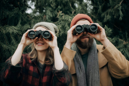 Young hikers using binoculars while exploring a forest, enjoying the beauty of nature and searching for wildlife