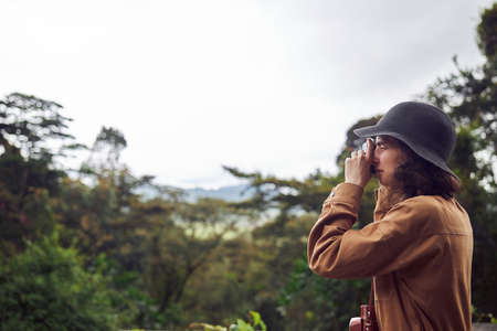 Adult traveler looking through binoculars in tropical green forest
