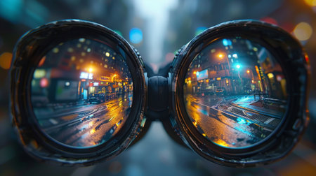 Binoculars reflecting cityscape at night representing concept of vision and exploration