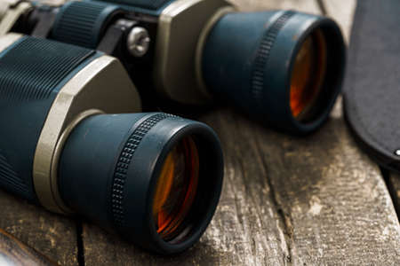 Hunting equipment binoculars on wooden background close up