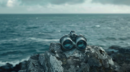 A pair of binoculars rests on a sturdy rock overlooking the ocean, where wind waves crash against the rocky shores and liquid water meets solid bedrock AIG50