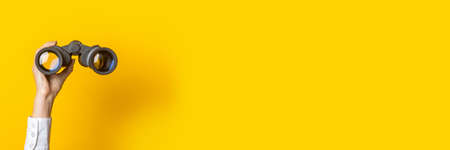 Female hand holds black binoculars on a yellow background. Journey, find and search concept. Banner