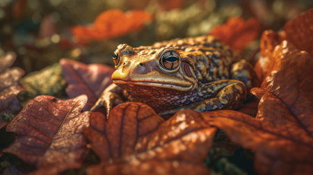 A small frog sits amidst brown fallen leaves on a forest floor, perfectly blending into its natural woodland habitat. The close-up perspective highlights the amphibian's textured skin and the autumnal tones of the environment.