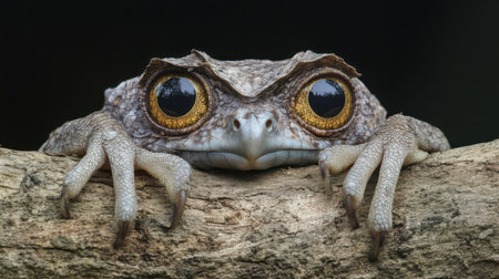 A large frog rests on a log showcasing its impressive yellow eyes and textured skin blending into the dark background of its habitat.