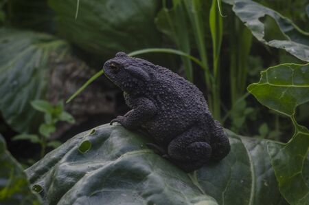 gray earth toad sitting on a cabbage leaf on a farm. Common toad, Bufo bufo, European toad, or simply the toad
