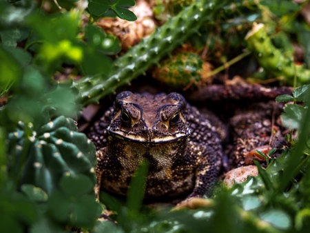 Tropical frog hides in green plants. Mimicry skill of tropical toad. Exotic animal closeup. Tropical fauna in zoo or terrarium. Frog or toad in summer foliage. Summer forest animal. Amphibian photo