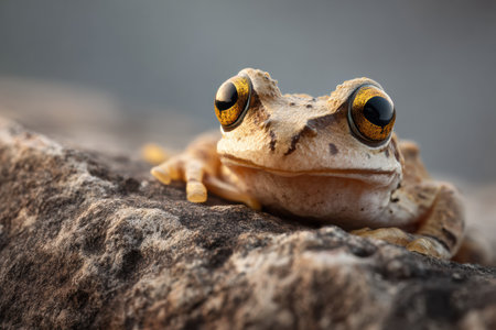 A frog with beautifully curious eyes is perched on a rugged rock, observing its surroundings intently. This close-up highlights its vibrant eyes and unique texture, set against a serene background.