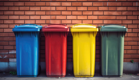 Colored recycling bins on the street near the brick wall, Generative AI