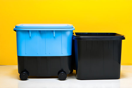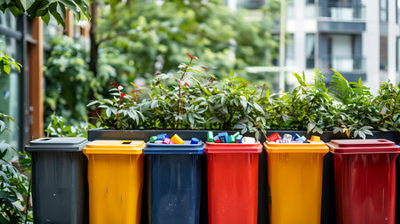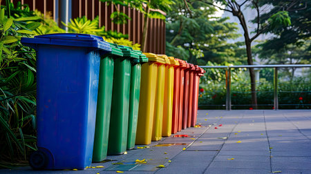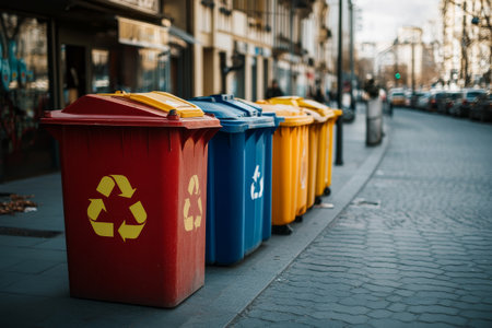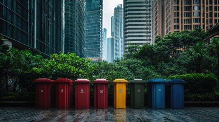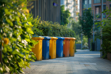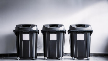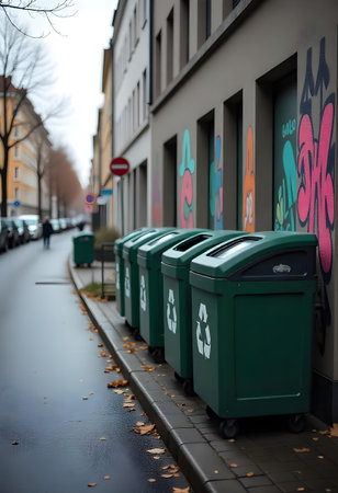 Trash bins aligned in a modern urban setting, symbolizing the importance of proper waste management in maintaining a clean, environmentally responsible city