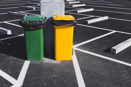 Garbage Solid Waste Container in Car Parking Lot, Separate Bins Trash Containers in The City Park. Rubbish Garbage for Hygienic Health Public Outdoor Parking. Zero Waste and Sustainable Environment