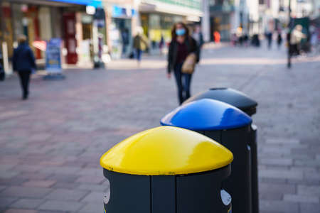 Three colorful trash cans in the pedestrian area during a pandemic. Selective focus.