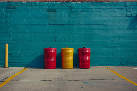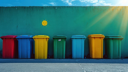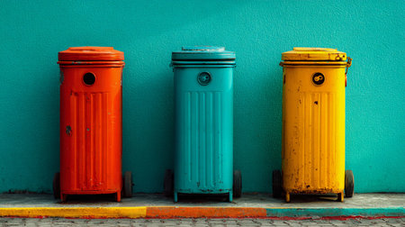 Colorful trash bins lined against a bright wall highlight urban waste management at a vibrant street location