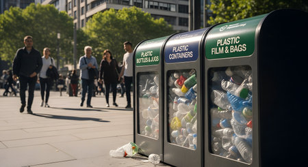 Clear recycling bins filled with plastic bottles and cans stand on a city sidewalk. People walk by in the background.