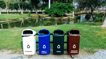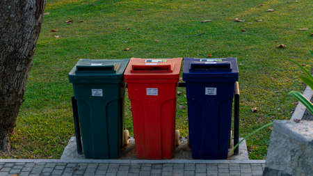 Different Colored Bins For Collection Of Recycle Materials ubicated in a park