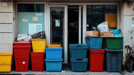 This vibrant scene features an assortment of colorful trash bins and boxes stacked near a building entrance in an urban environment.