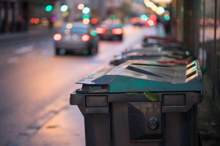 Urban street life with garbage container and street lights