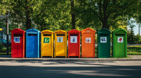 A colorful array of outdoor trash bins lined up in a park, with signs indicating recycling options, promoting environmental awareness and responsible waste disposal.