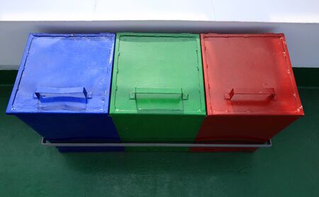 Different colored recycle garbage trash Bins at Sidewalk. Old Recycling Garbage for Environment.