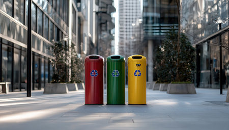 Vibrant blue, yellow, and red recycle bins on a busy city street, encouraging eco-friendly practices and efficient waste disposal.