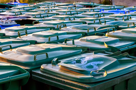 Southwold, UK - August 15, 2016 - Many green plastic refuse wheelie bins lined up outside for tourists