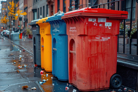 Multicolored recycling bins lined up on a sidewalk in New York City promote responsible waste management and environmental sustainability