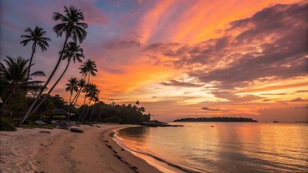 A serene tropical beach at sunset with tall palm trees silhouetted against a vibrant sky. The ocean is calm, reflecting the warm hues of orange, yellow, pink, and purple from the setting sun. The sandy shore curves gently, leading to the tranquil waters. In the distance, a small island is visible on the horizon, adding to the picturesque scenery. The overall mood is peaceful and relaxing, evoking a sense of tranquility and escape.