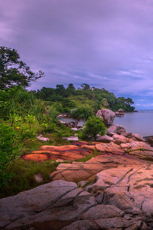 Stretched out white sand beach with natural rock formation at the coastline on the horizon in Belitung Island in the afternoon, Indonesia.