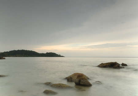 Peaceful and tropical coral turtle beach at Perhentian Islands, Malaysia, long exposure, with cloudy sky during sunset.. Postcard, mural or wallpaper about Malaysian tourism or travel
