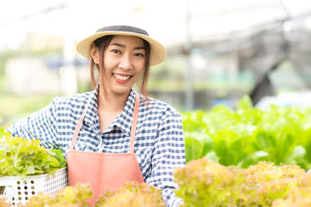 Asian woman farmers harvest fresh salad vegetables in hydroponic plant system farms in the greenhouse to market. Concept of fresh vegetables and healthy food. Business and Agricultural industry.