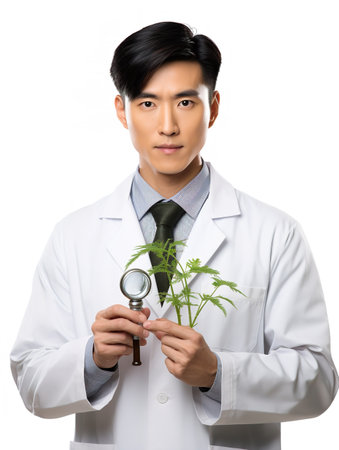Marijuana researcher Asianman working in a hemp field, Examining plants. Concept of herbal alternative medicine.
